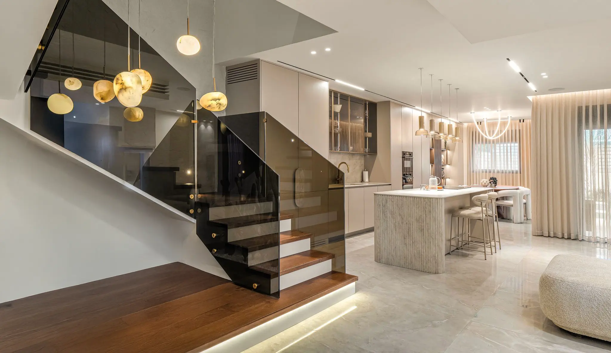 מעקות זכוכית למדרגות משלבים בטיחות מקסימלית עם עיצוב אלגנטי ומודרני. הזכוכית השקופה שומרת על תחושת המרחב הפתוח ומאפשרת חדירת אור טבעי מקסימלית לבית.
